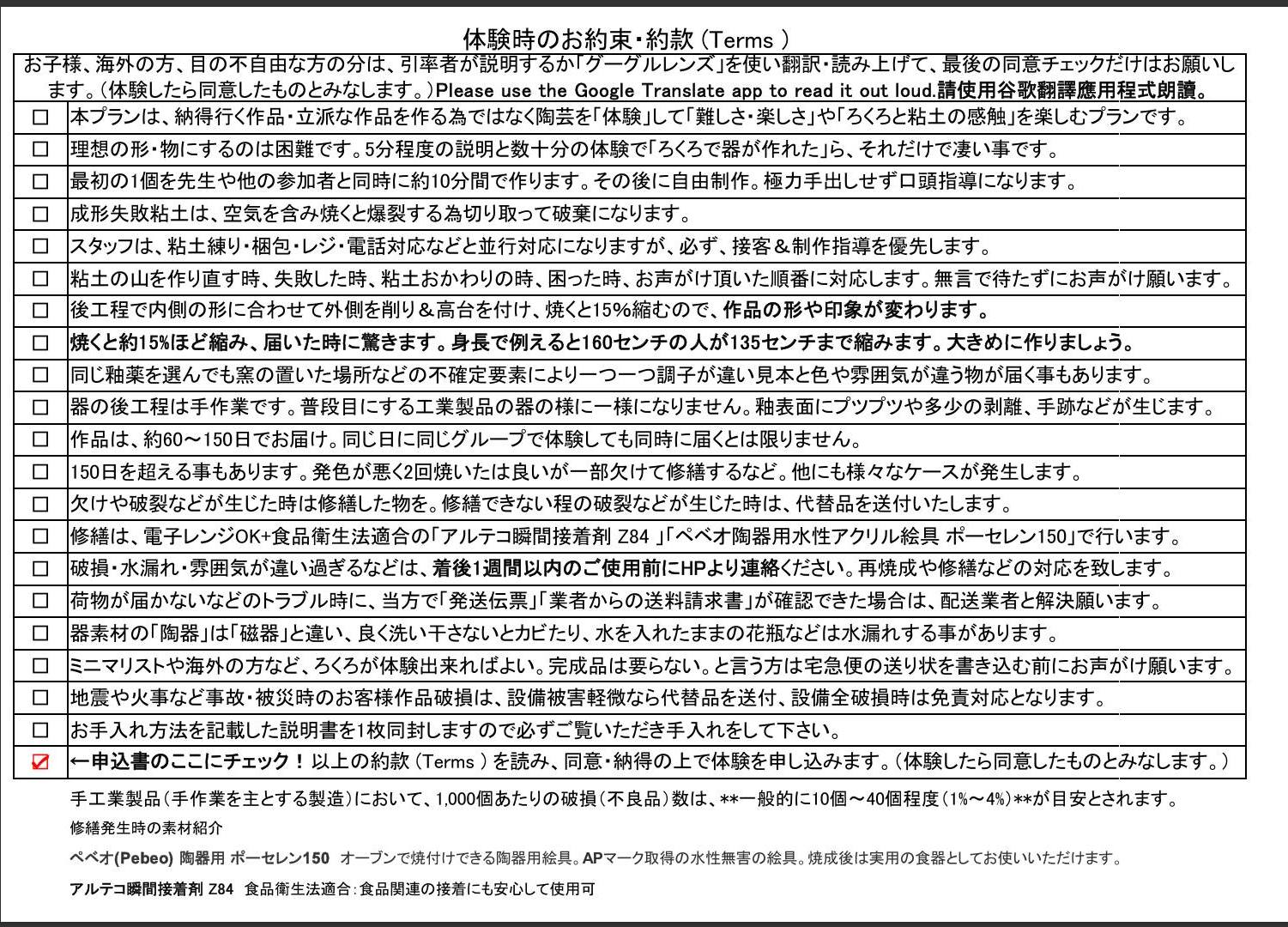 体験時に了承していただく規約